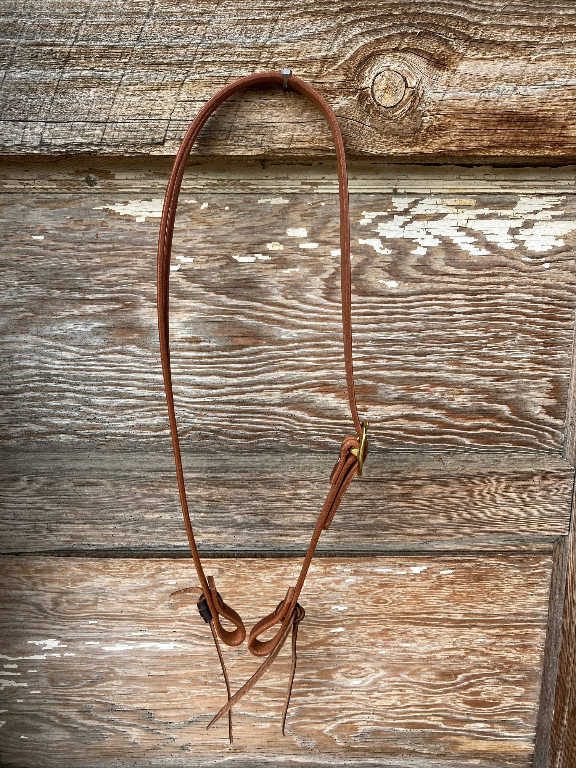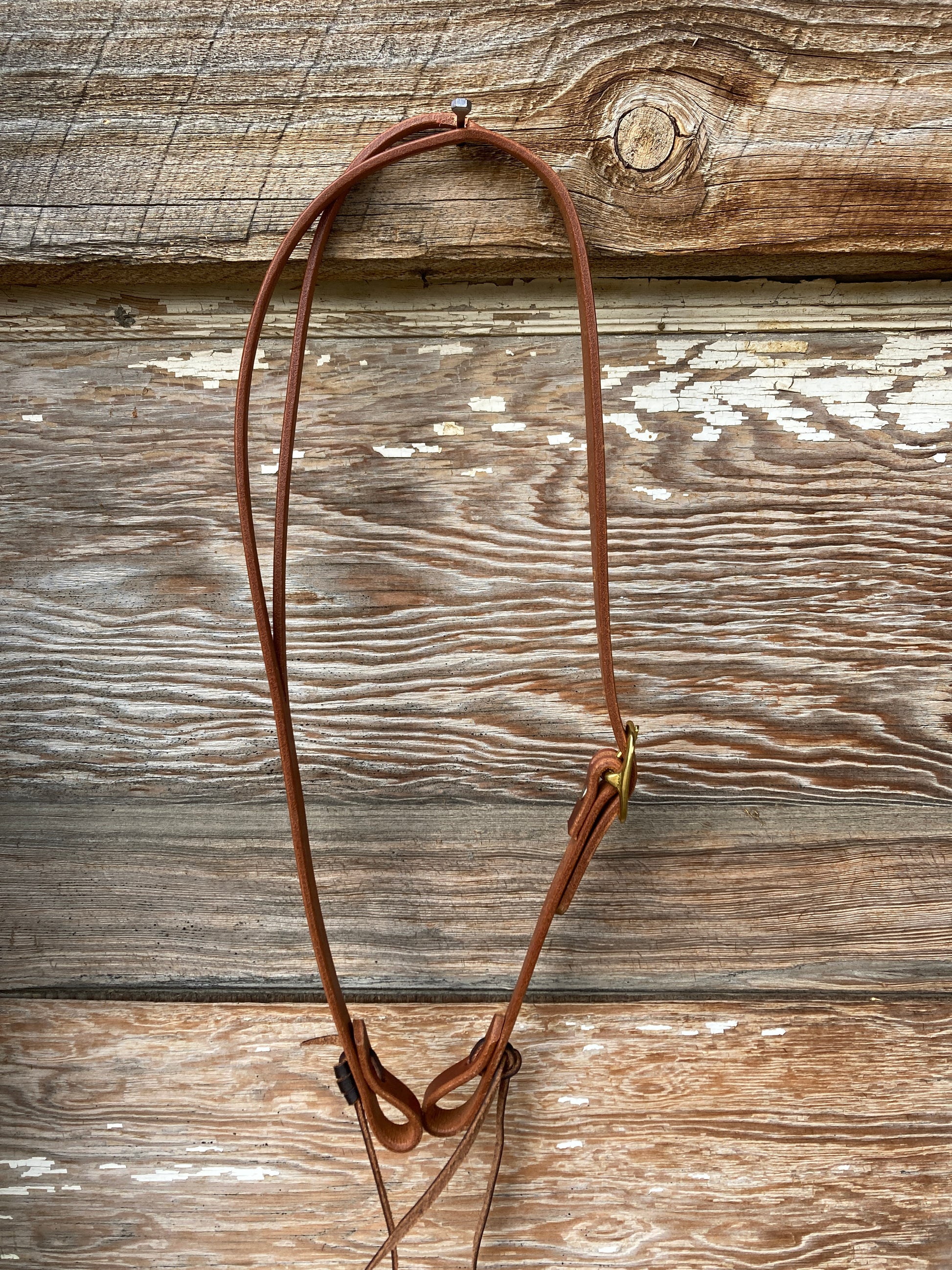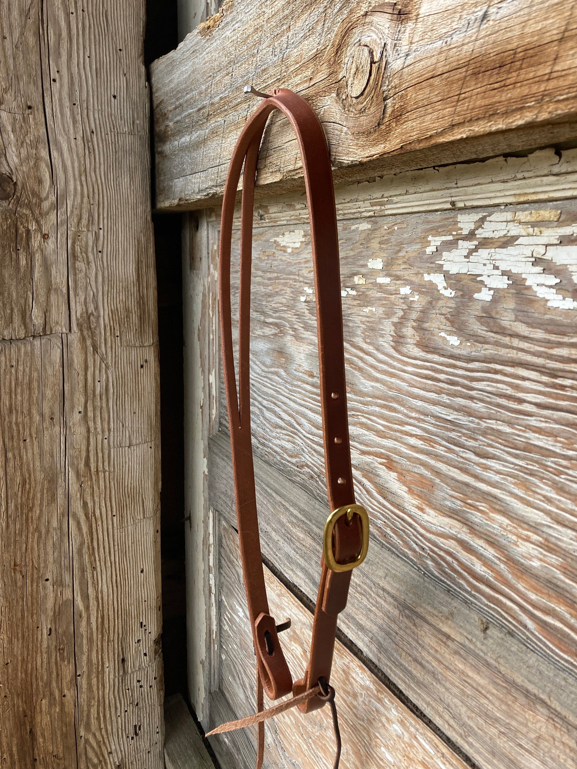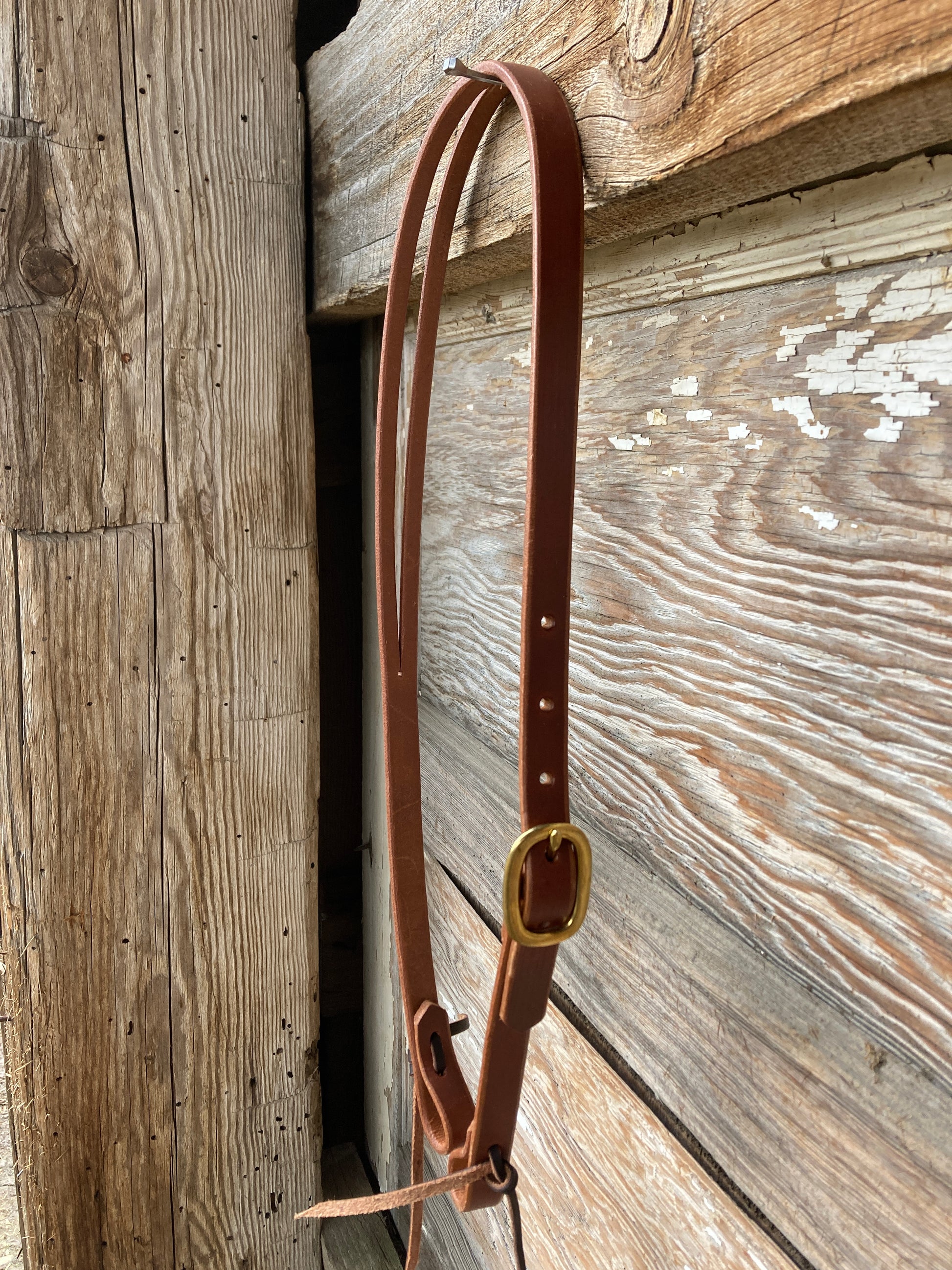 Oiled Herman Oak harness leather Slit Ear Headstall. Lace tie cheeks. Single buckle adjustment in solid brass.
